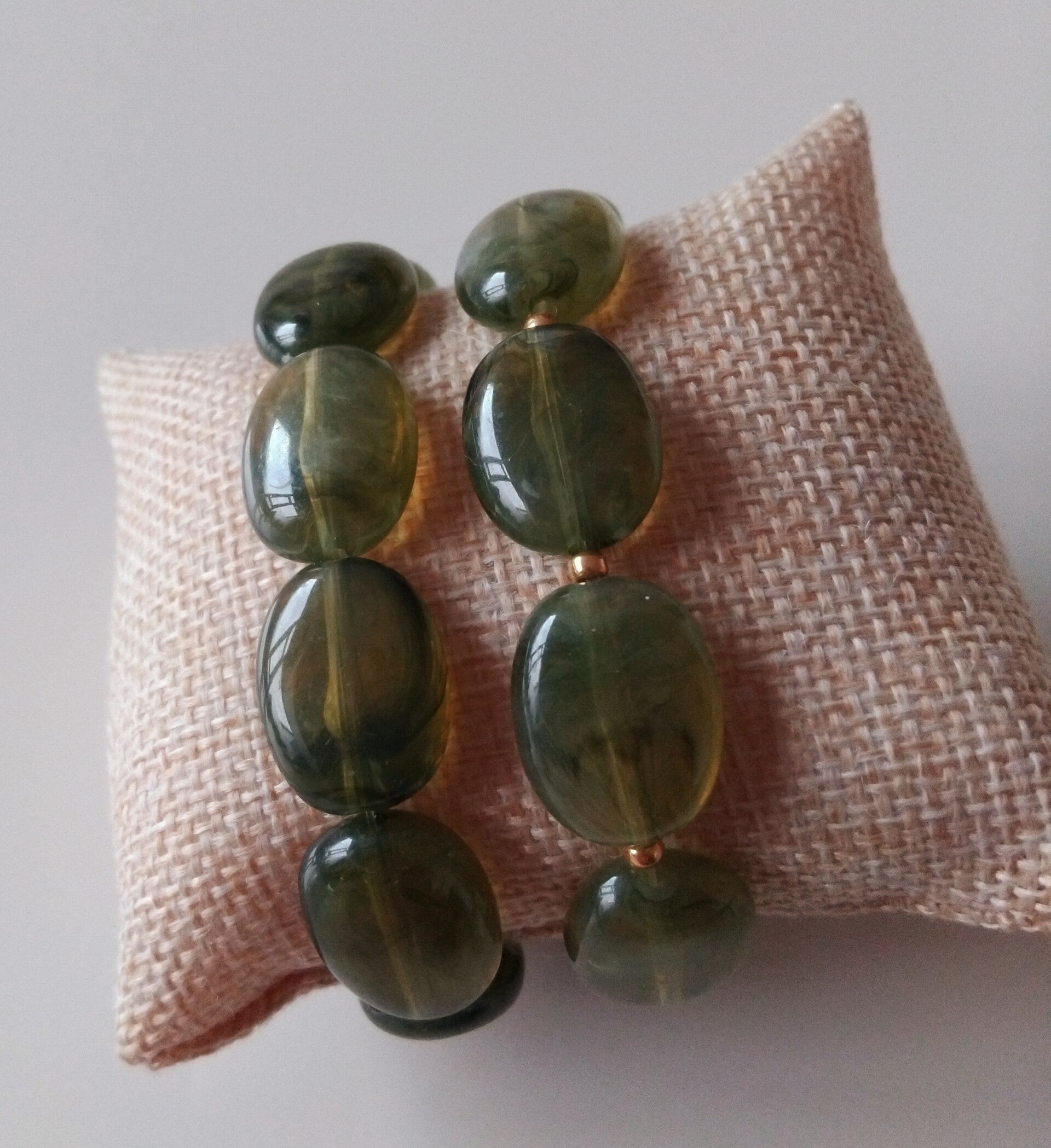 Twee mooie, originele armbanden in olijfgroen. De armband met tussenkraaltjes is 18/ 18,5 cm. Zonder tussenkraal is de armband 17 cm. De prijs is per stuk.