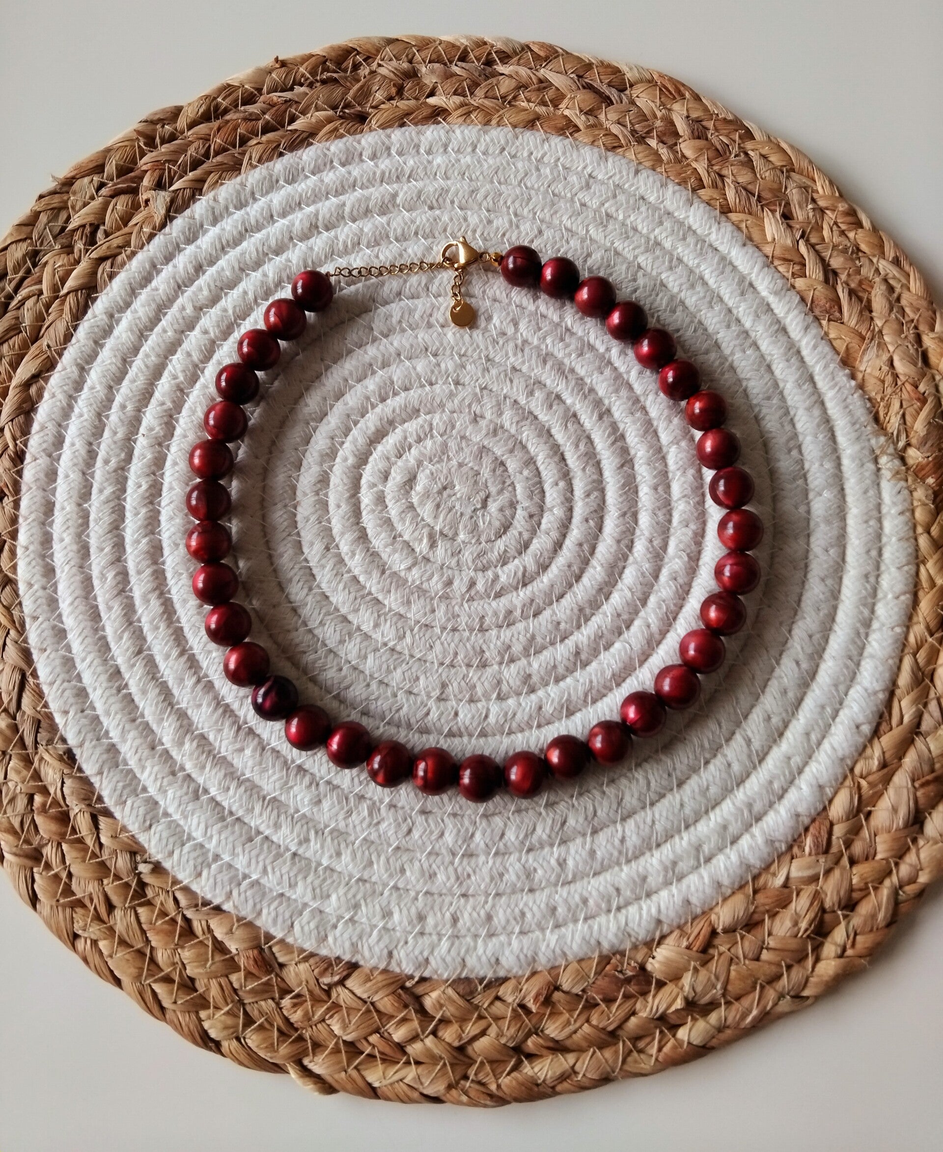 Hele mooie ketting van 12 mm CAT EYE kralen in bordeauxrood. Door het licht of bij bewegen zie je de kleuren veranderen. De maat is 39-44 cm inclusief verlengkettinkje.